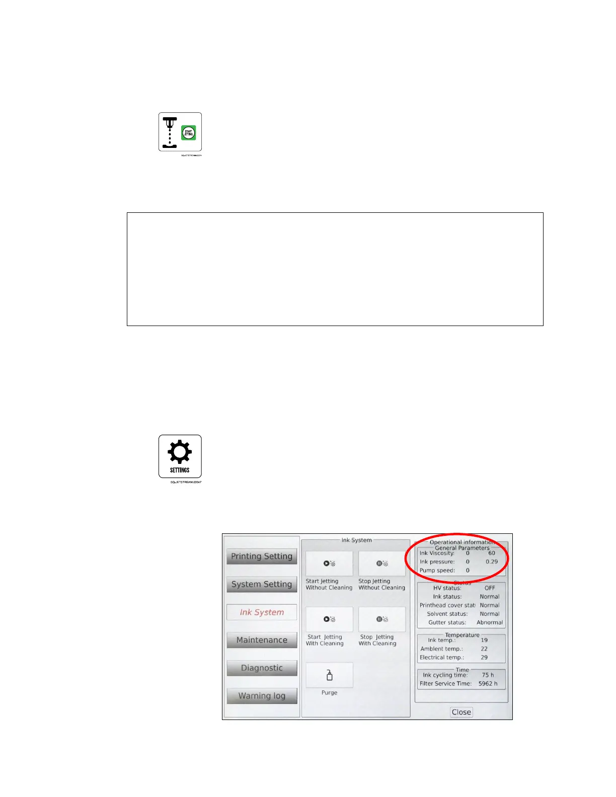 The Ink Viscosity reading on the left is the current ink viscosity, updated every