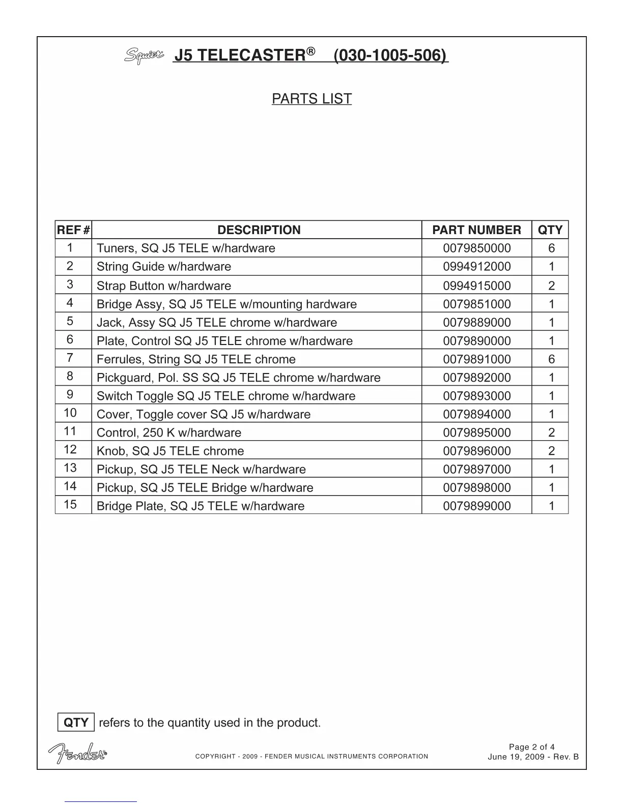 Squier J5 Telecaster - Tuners; String Guide; Strap Buttons; Bridge Assembly