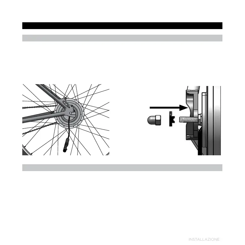 1. Installare la ruota posteriore nei forcellini posteriori. Ruotare la ruota in modo che il connettore sia