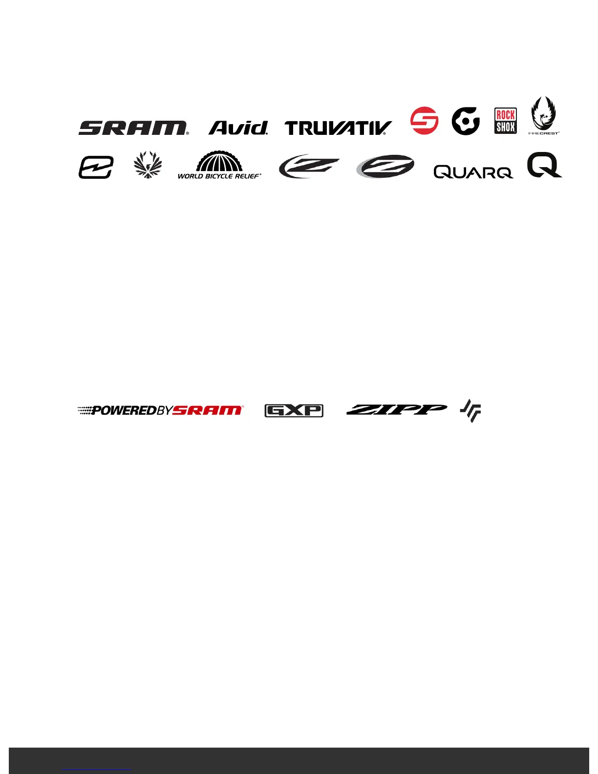 SRAM FORCE®, SRAM RED®, SRAM RIVAL®, SRAM VIA®, Stylo®, Torpedo®, The Power of Bicycles®, Truvativ®, Varicrank®, Velotron®,