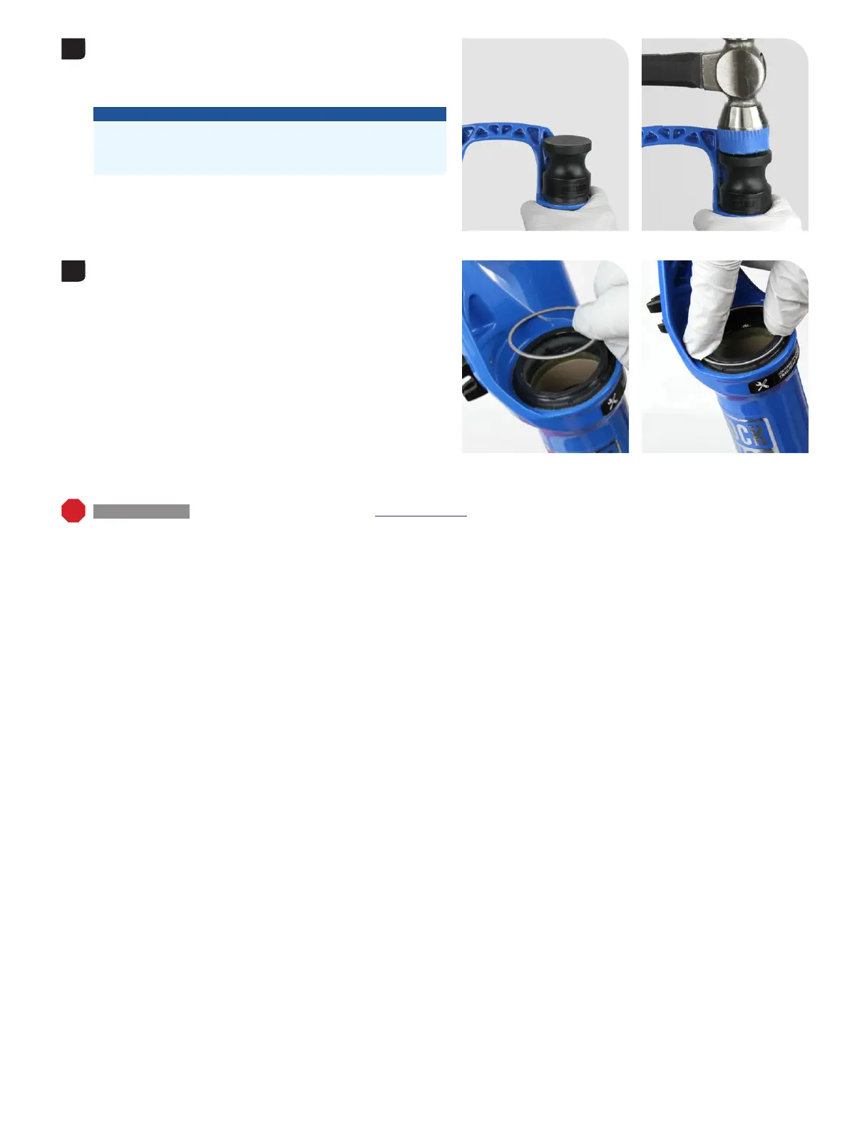 Hold the lower leg steady and use a mallet to seat the dust wiper Hold the lower leg steady and use a mallet to seat the dust wiper