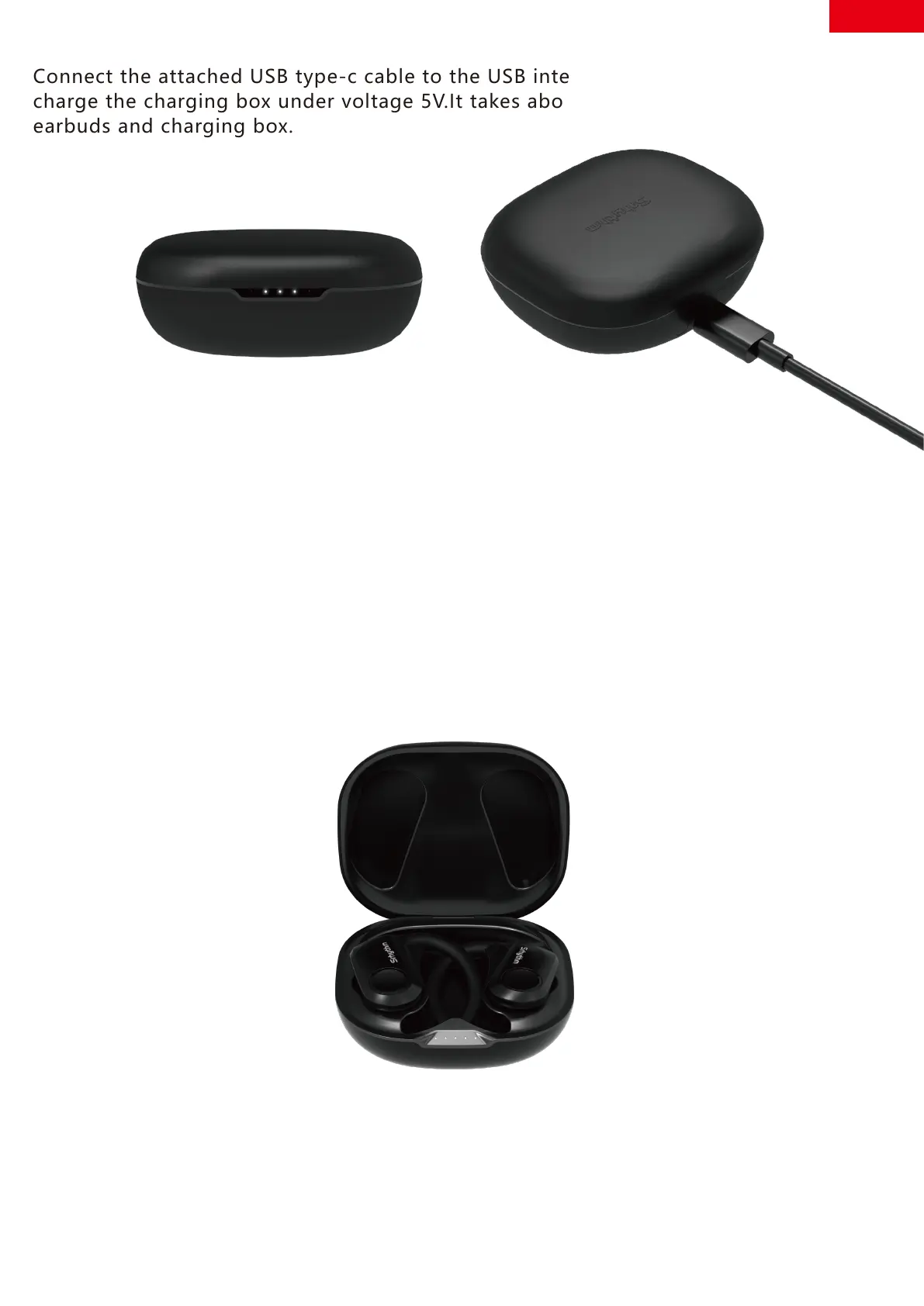 charge the charging box under voltage 5V.It takes about 1-1.5 hours to fully charge