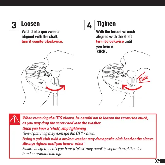 Failure to tighten until you hear a ‘click’ may result in separation of the club
