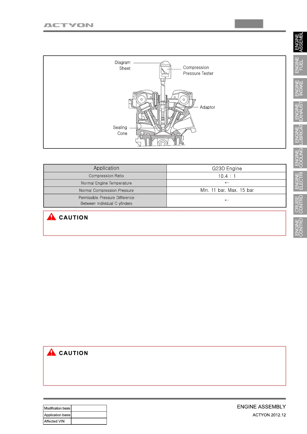 If measured value is not within the specifications, perform the cylinder pressure leakage test.