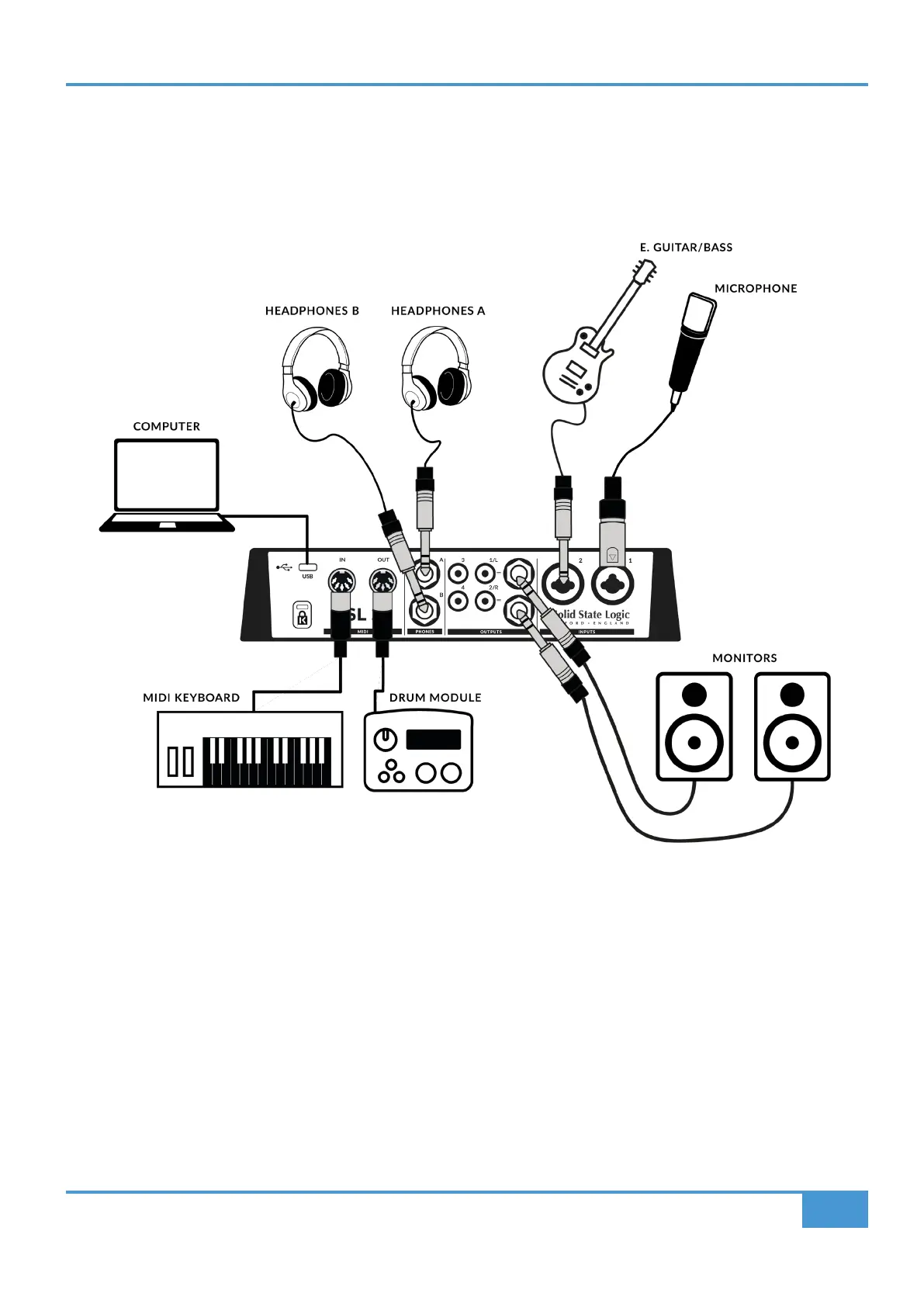 The diagram below illustrates where the various elements of your studio connect to SSL 2+ on the rear panel.