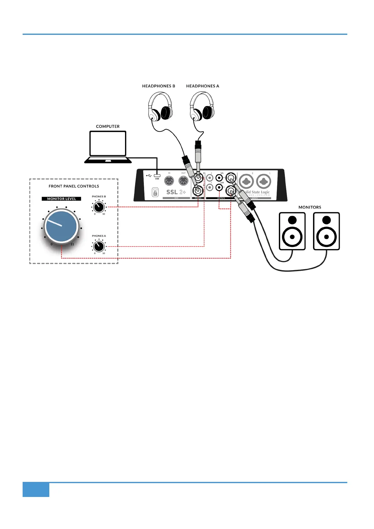 The diagram below shows where to connect your monitors and headphones up to your SSL 2+. It also shows the interaction of the
