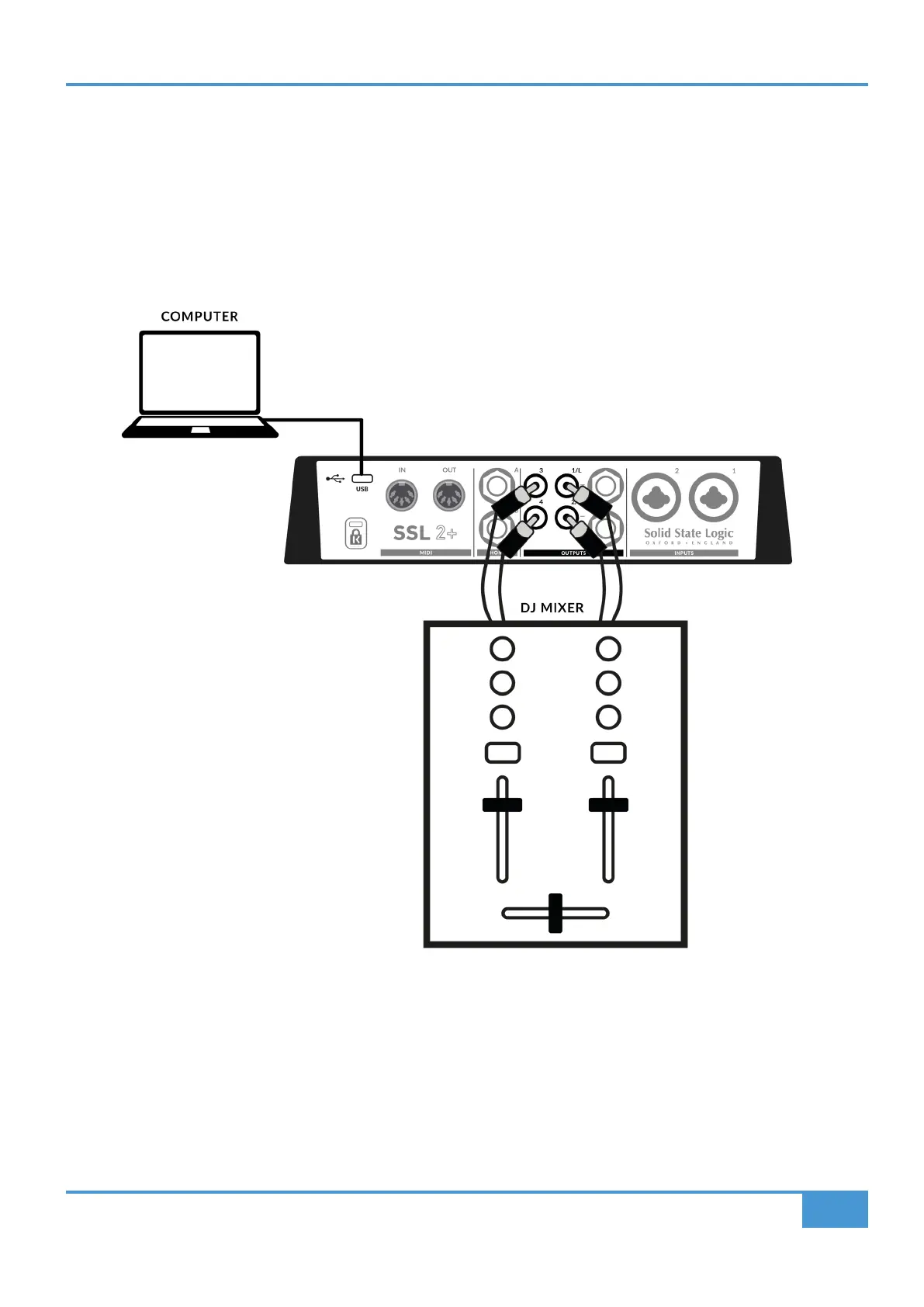 The diagram below shows how to connect your SSL 2+ to a DJ mixer, making use of the 4 RCA outputs on the rear panel. In this