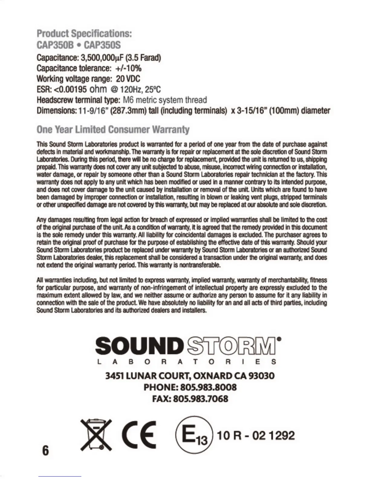 Ssl CAP350B - Product Information and Warranty; Product Specifications; One Year Limited Consumer Warranty
