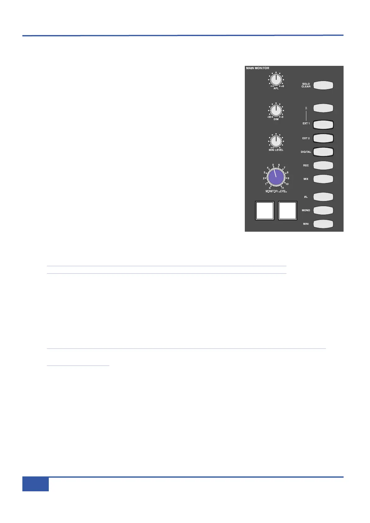 The top button in the monitoring area, labelled SOLO CLEAR, clears any SOLO or AFL buttons that are active on the desk,