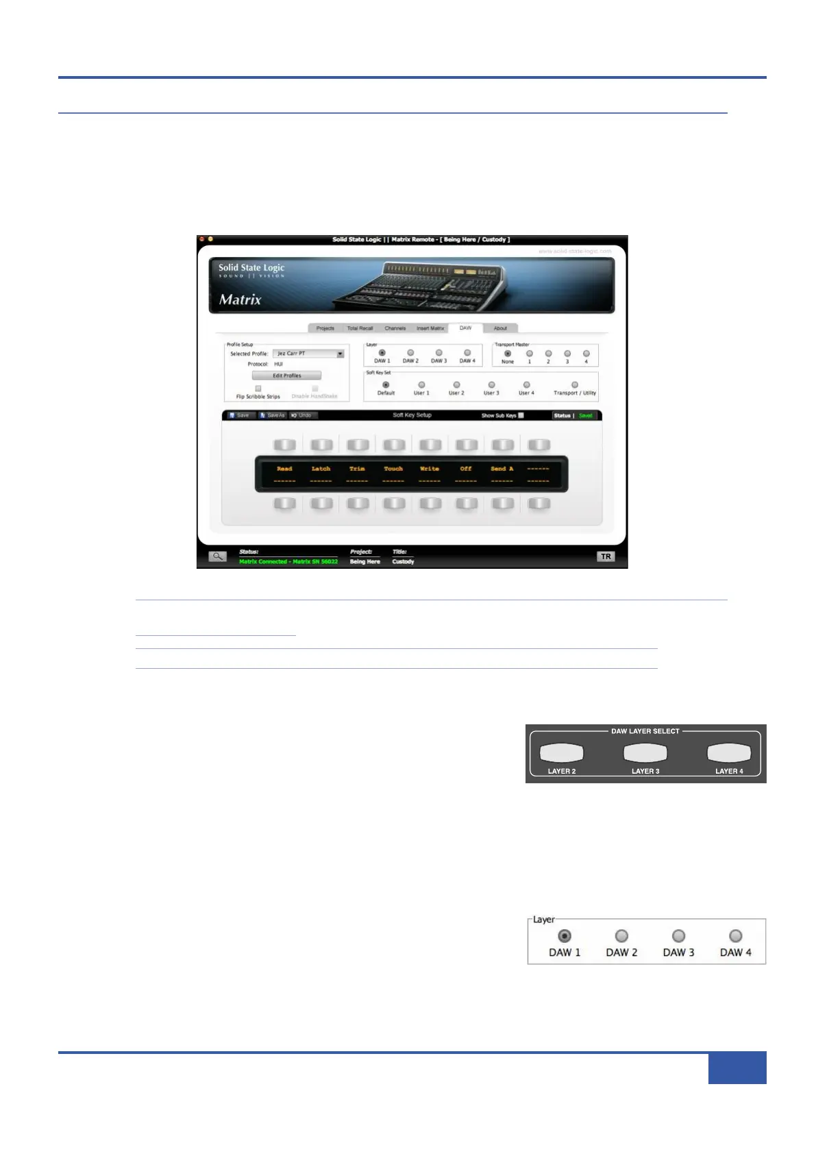 The layer being configured in Matrix Remote is selected via the DAW tab’s Layer