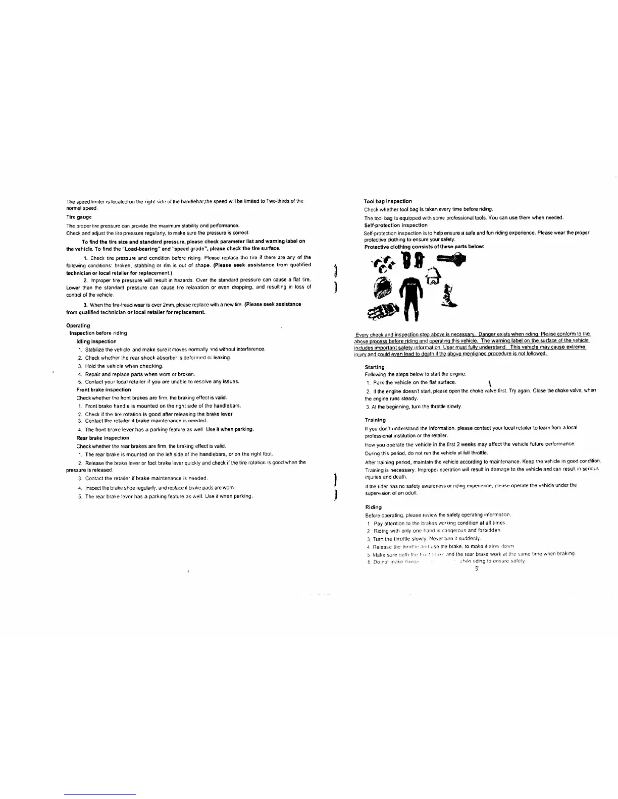 SSR SX50 - Vehicle Operation and Inspection; Inspection Before Riding; Starting the Engine; Rider Training