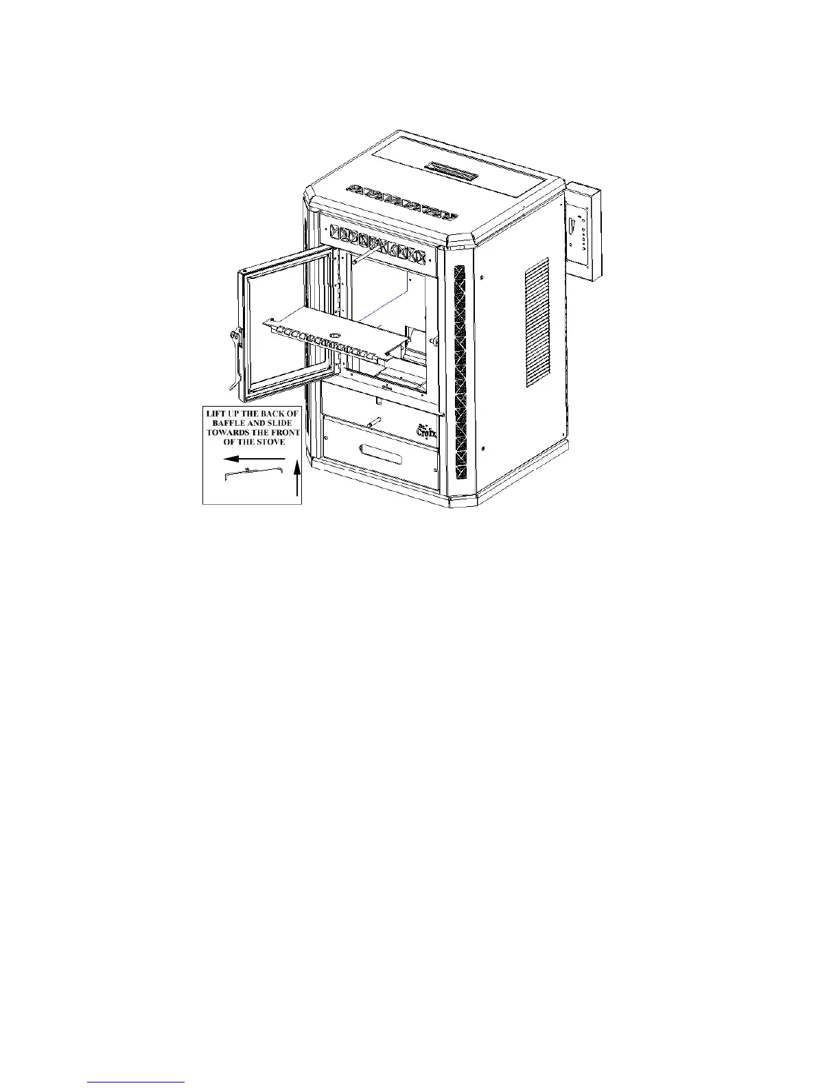 slide towards the front of the Stove. The baffle will slide out of the keyhole slots and drop