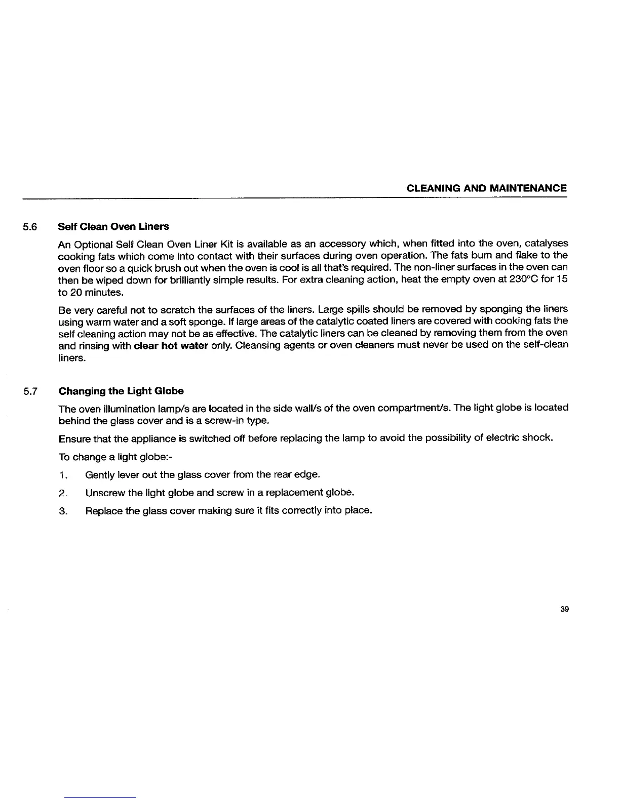 St George UES2B - Self Clean Oven Liners; Changing the Light Globe