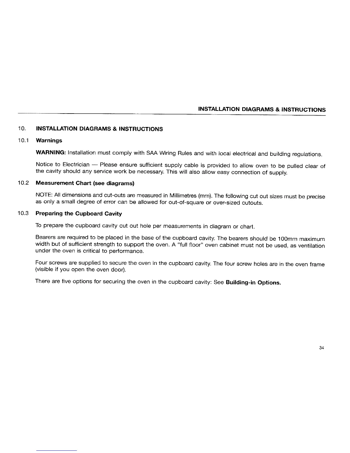 St George WEOM7 A - INSTALLATION DIAGRAMS & INSTRUCTIONS; Installation Warnings and Requirements; Preparing the Cupboard Cavity