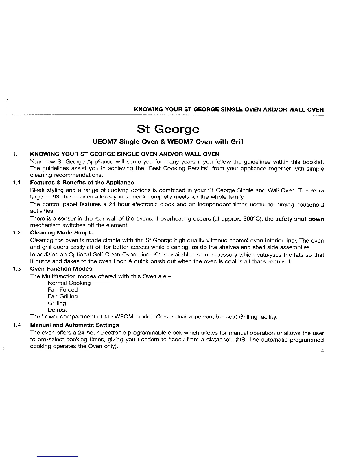 St George WEOM7 A - KNOWING YOUR ST GEORGE ELECTRIC OVEN; Features & Benefits of the Appliance; Cleaning Made Simple; Oven Function Modes