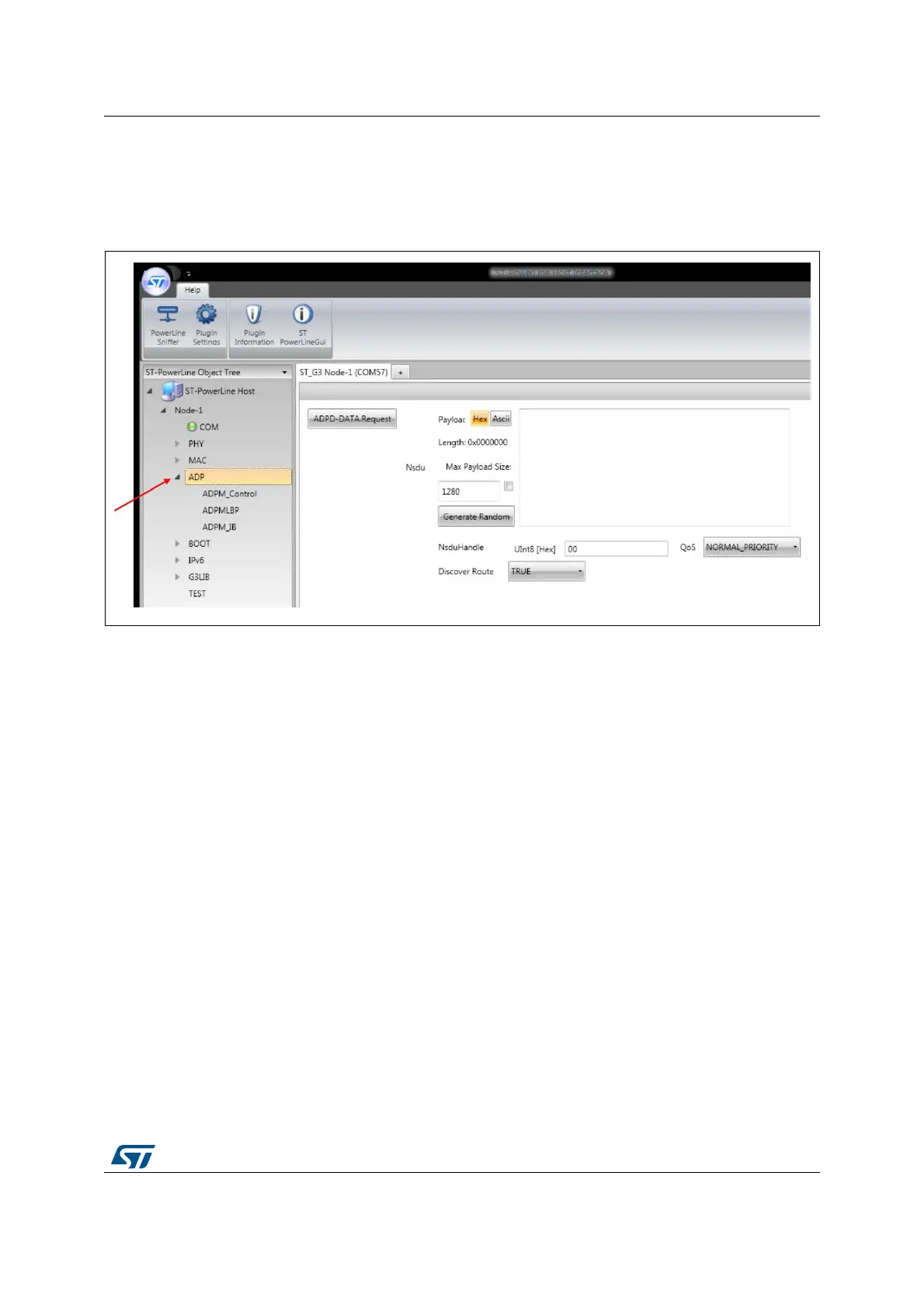 The root menu offers the possibility to enter a payload and send it at the ADP layer, as