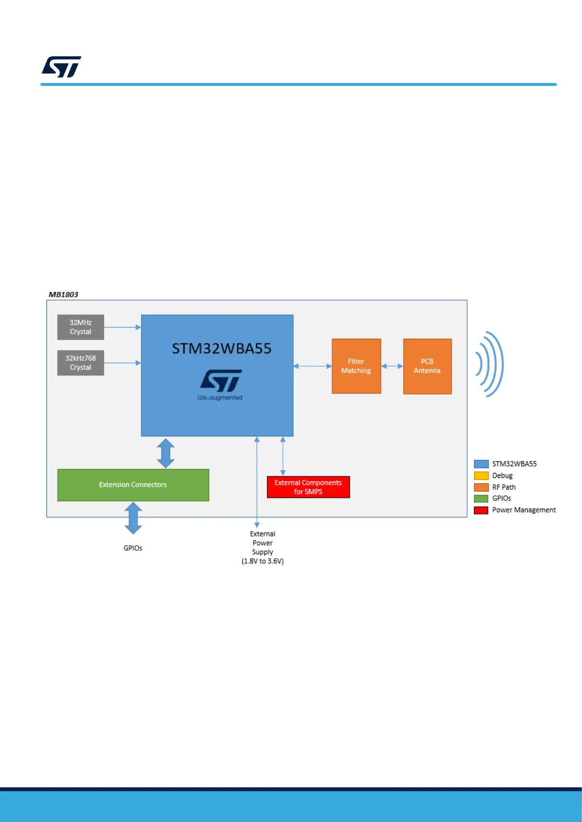 MCU RF board. The hardware block diagram in Figure 2 illustrates the connection between STM32WBA55CG