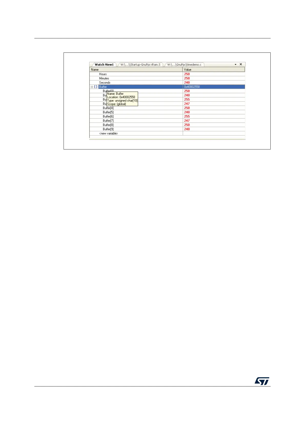 configuration that stops program execution when a write access to the variable Buffer[0]