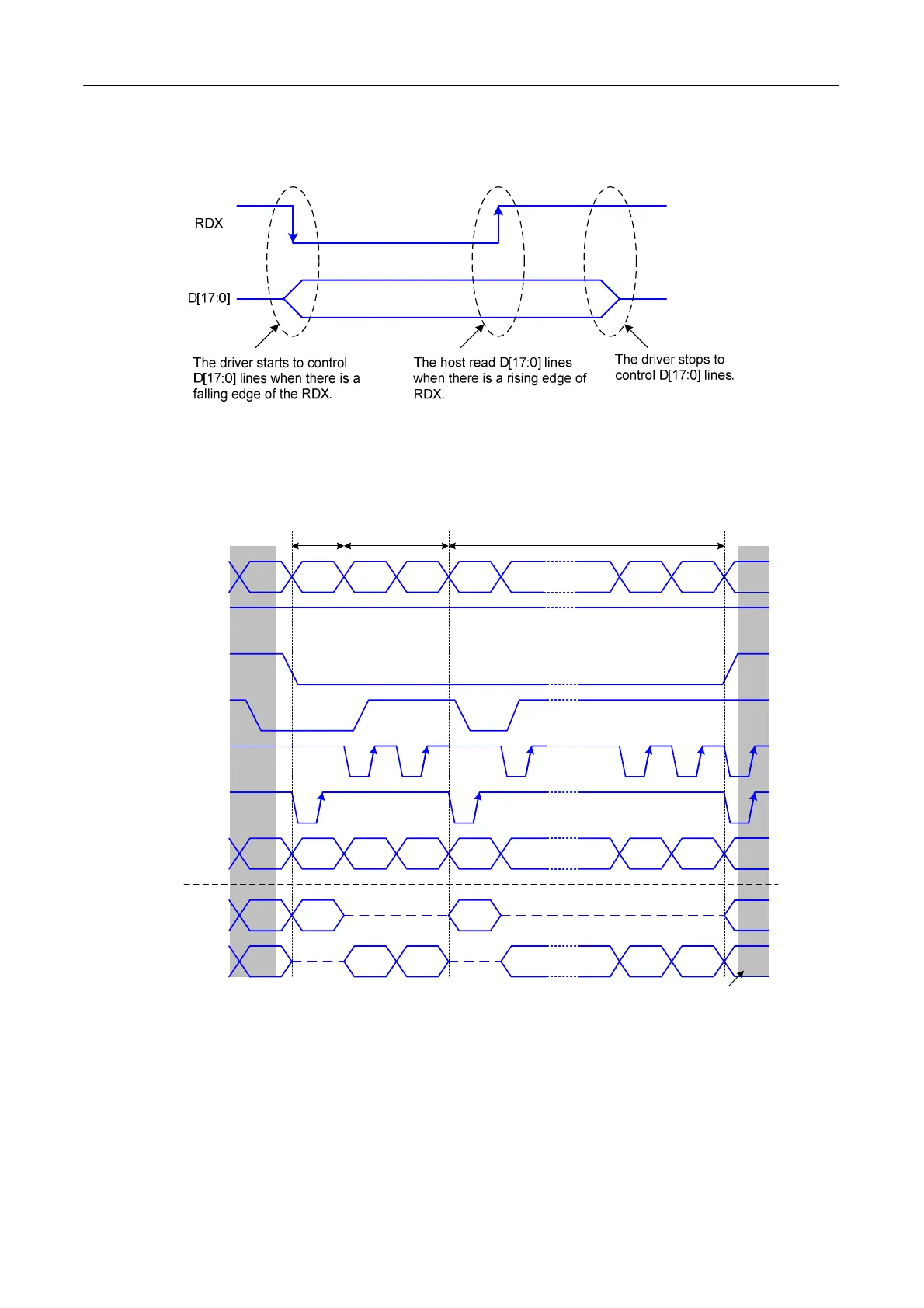 driver sends data (D[17:0]) to the host when there is a falling edge of RDX and the host reads data when there is a rising