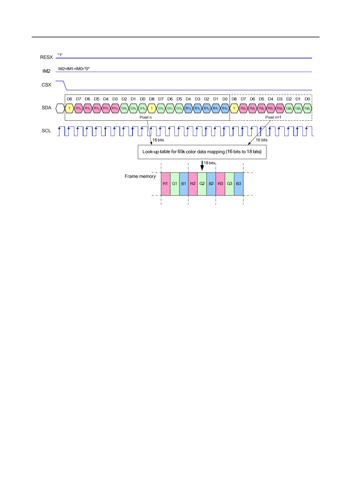 9.8.17 Write data for 16-bit/pixel (RGB 5-6-5-bit input), 65K-Colors, 3AH=“05h”