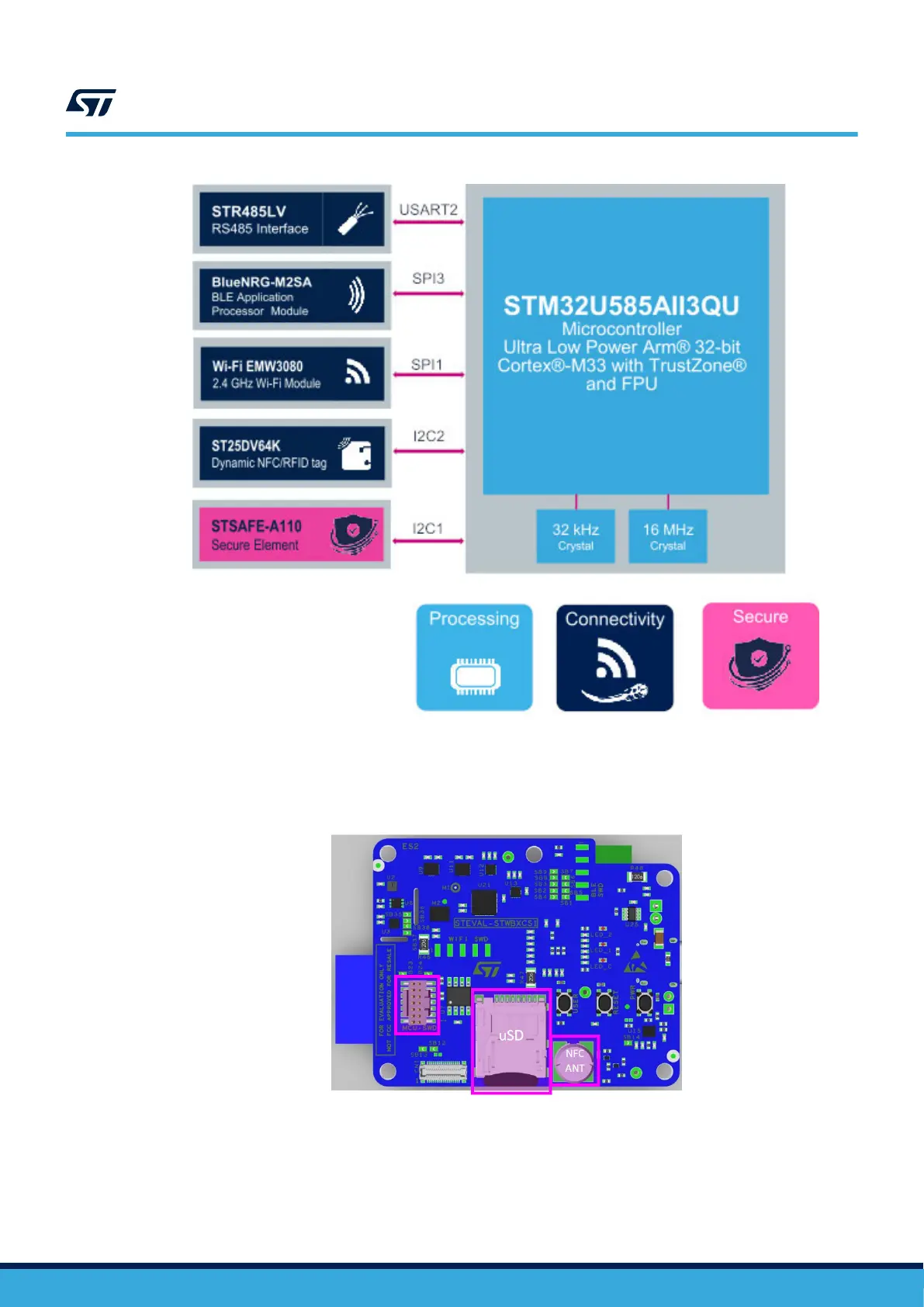ST STEVAL-STWINBX1 - Figure 11. Main Connectivity Components and the STM32 U585 AI Processing Unit; Figure 12. MCU and Connectivity Components (Top View)