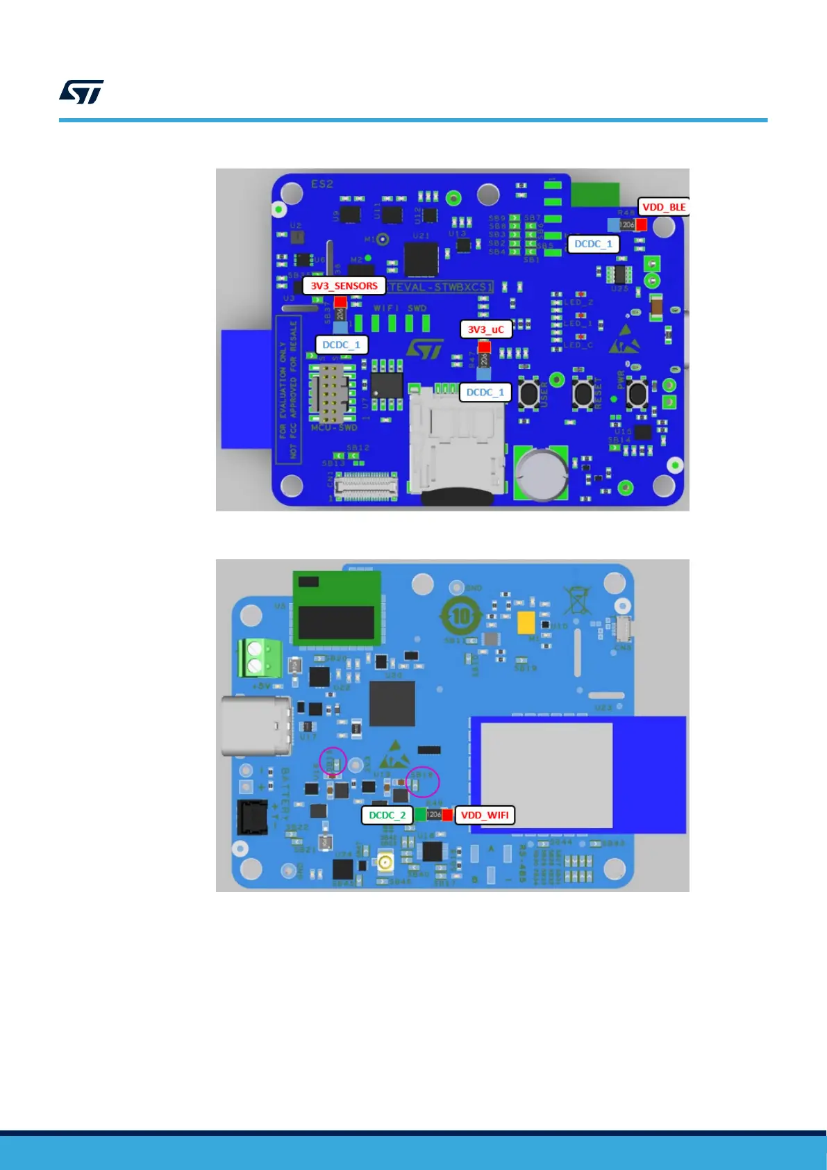 ST STEVAL-STWINBX1 - Figure 19. Stwin.box Core System Resistors and Solder Bridges (Top View); Figure 20. Stwin.box Core System Resistors and Solder Bridges (Bottom View)