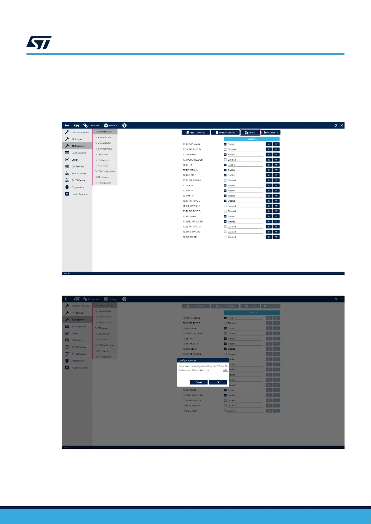 clicking the “Save TX” button in the TX Registers tab or the Common Registers tab, entering a configuration ID