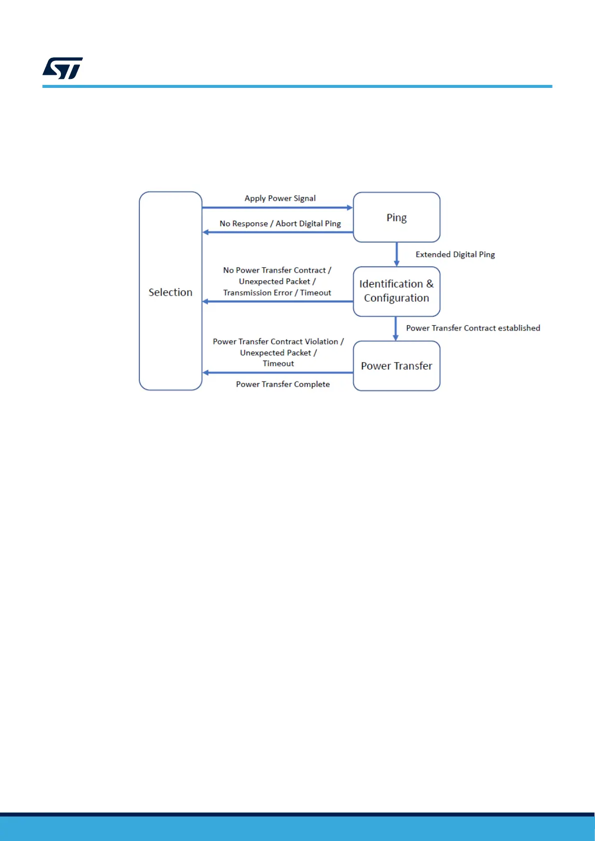 • Selection: is the default state in which the power transmitter periodically scans its wireless power interface
