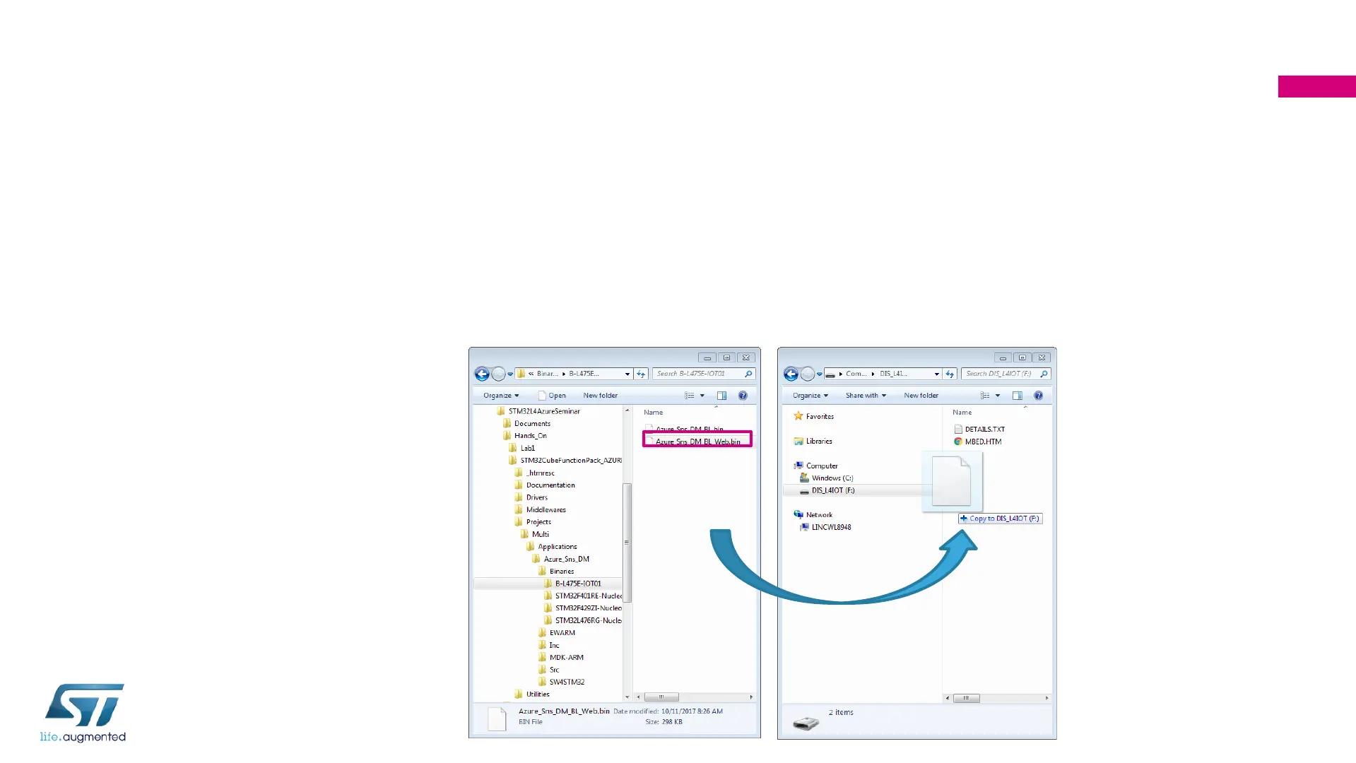 • Drag and drop the “Azure_Sns_DM_BL_Web.bin” file to the Discovery kit “DIS_L4IOT” drive