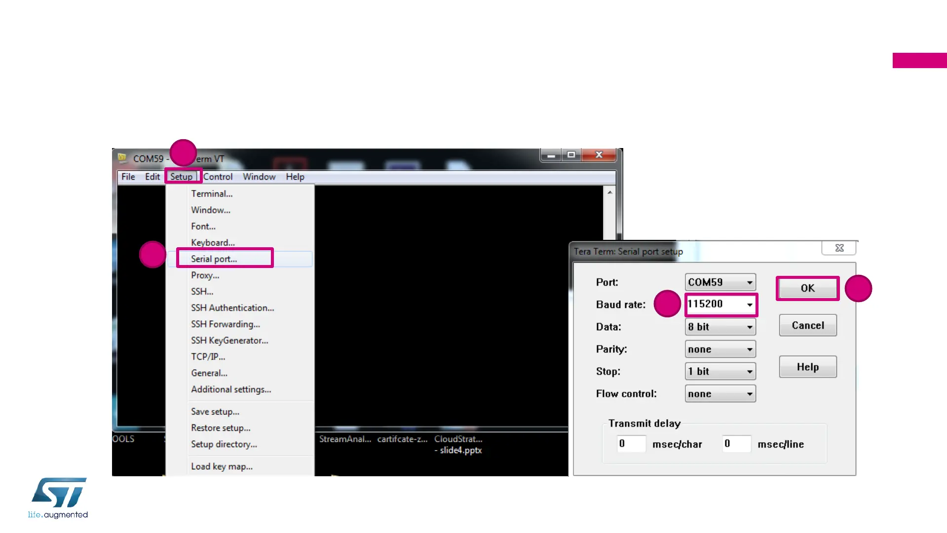 Set baud rate speed in serial terminal to 115200 (Setup Serial port)