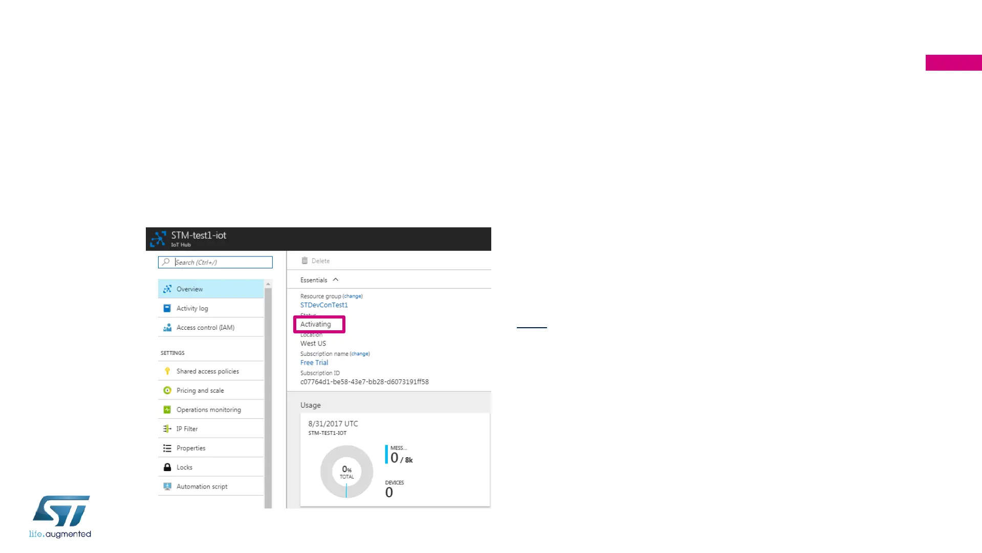 • If you see the status of your newly created IoT Hub as “Activating”,
