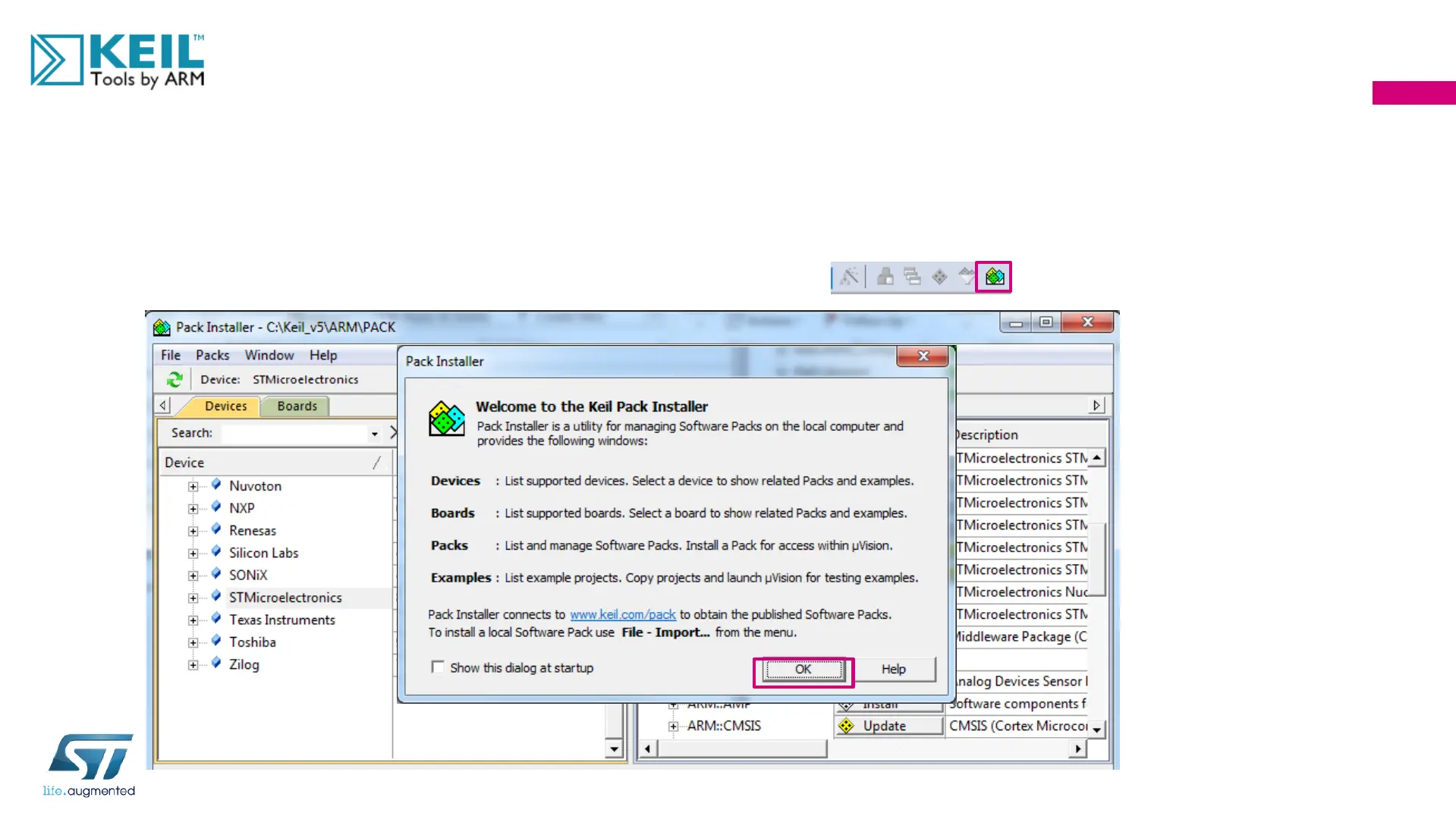Keil will automatically prompt you to install the Device Family Packs.