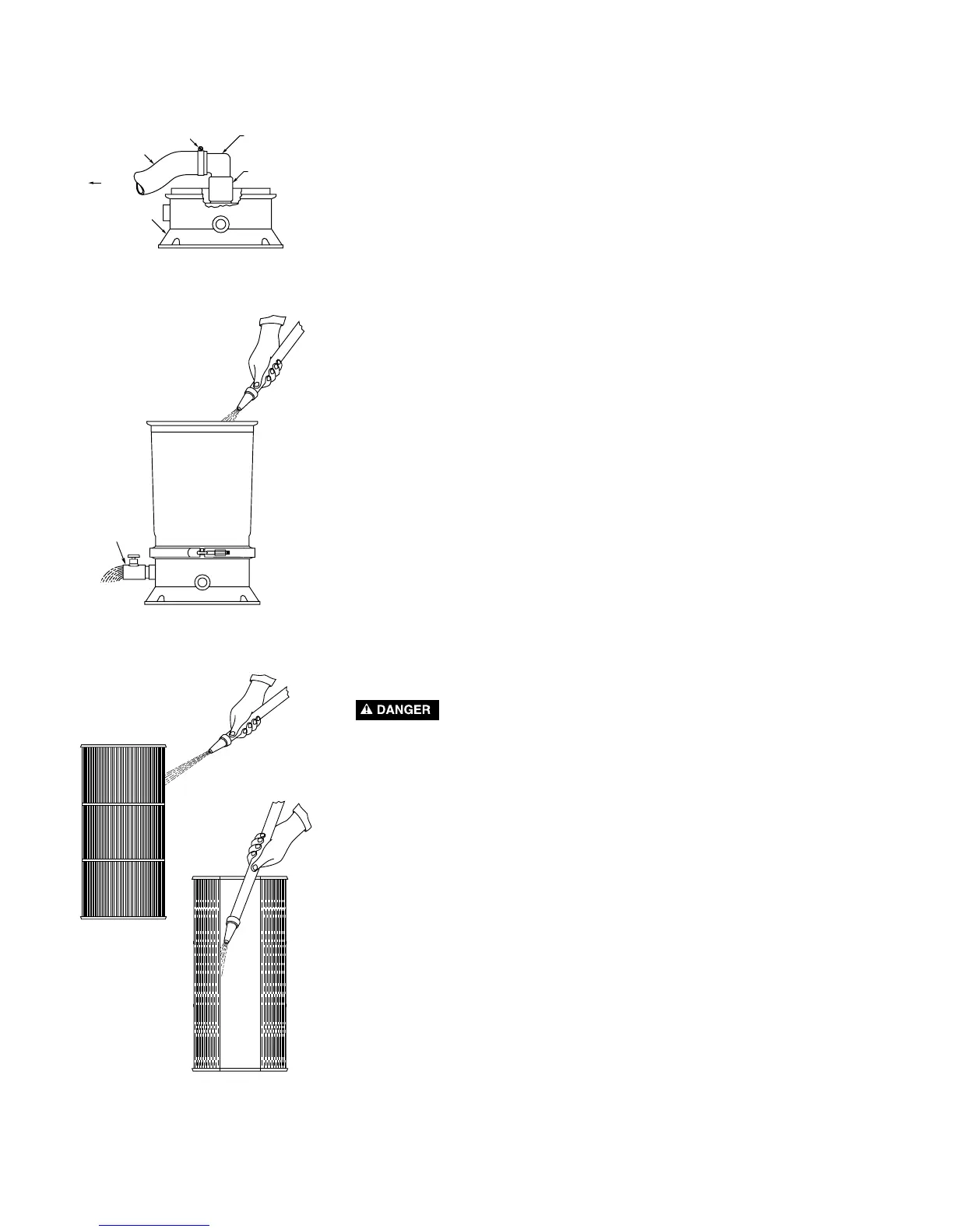 1. Use a garden hose with straight flow nozzle to wash down filter element