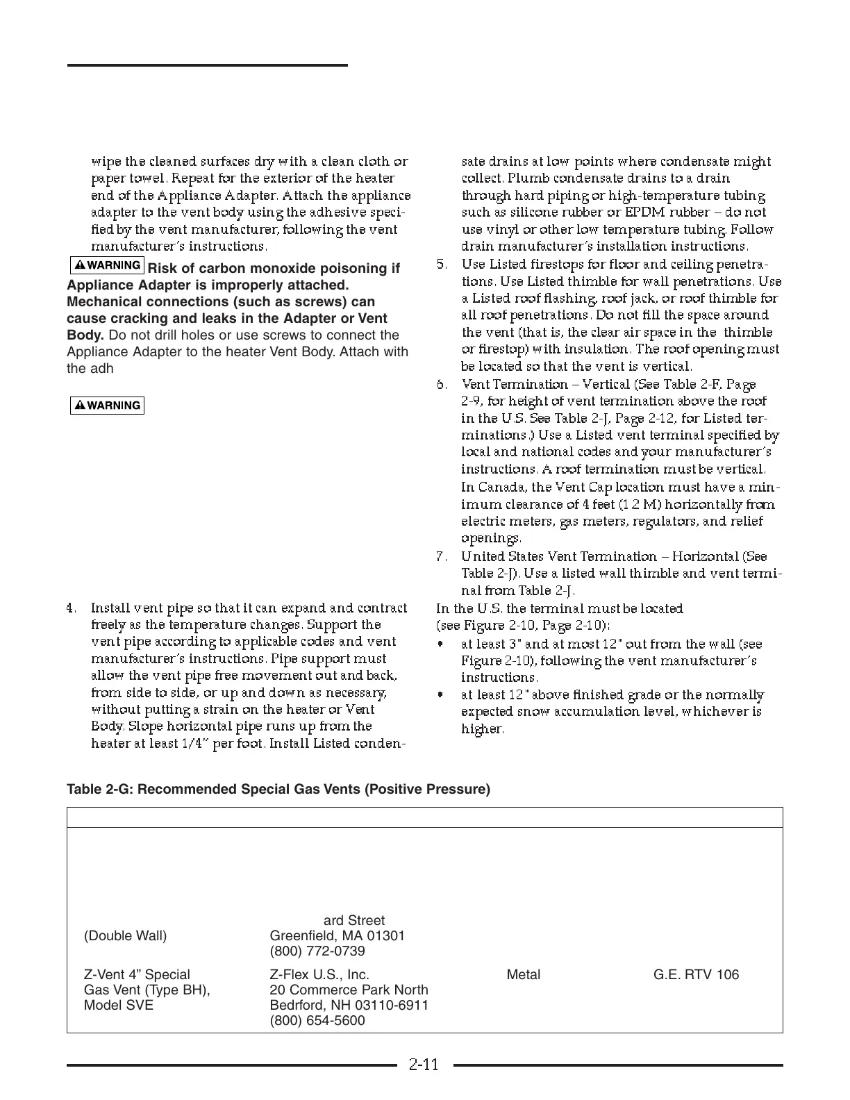 Table 2-G: Recommended Special Gas Vents (Positive Pressure)