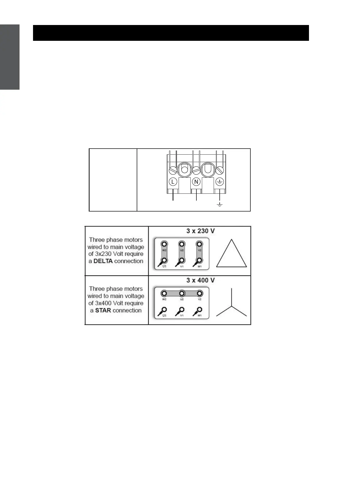 Single-phase motors should be connected at the two terminals as indicated below.