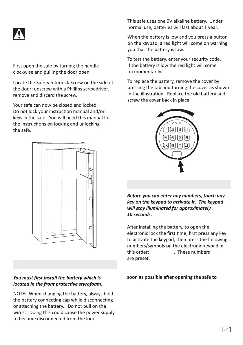 Stack-On TD5518-24-GP-E-S - Initial Safe Setup and Operation; Safety Interlock Screw Removal; Battery Installation and Replacement; Electronic Lock Activation