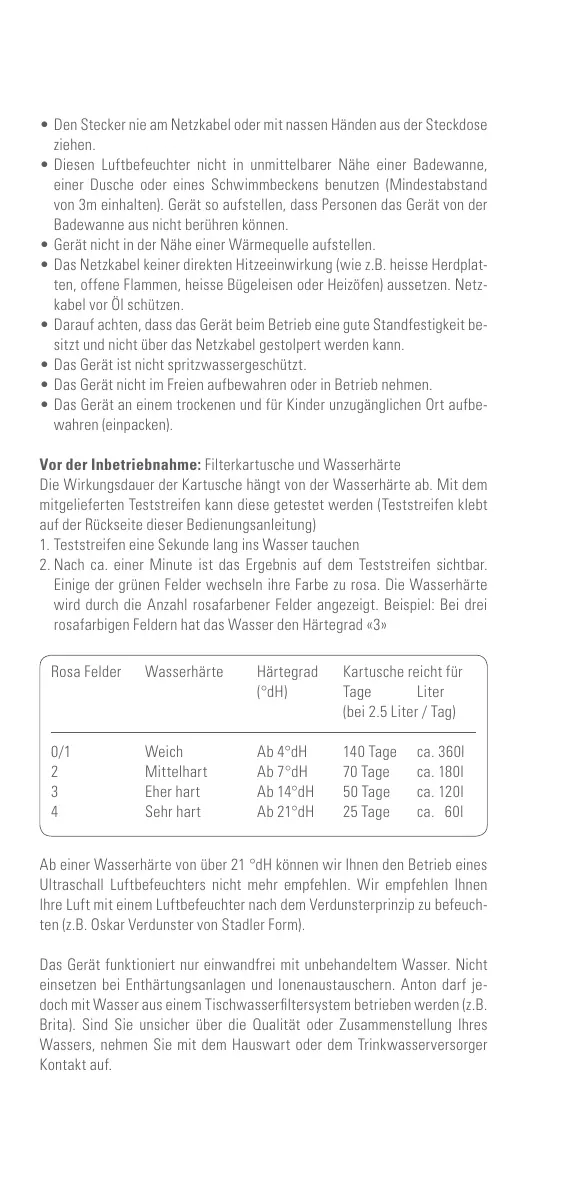 Das Gerät funktioniert nur einwandfrei mit unbehandeltem Wasser. Nicht