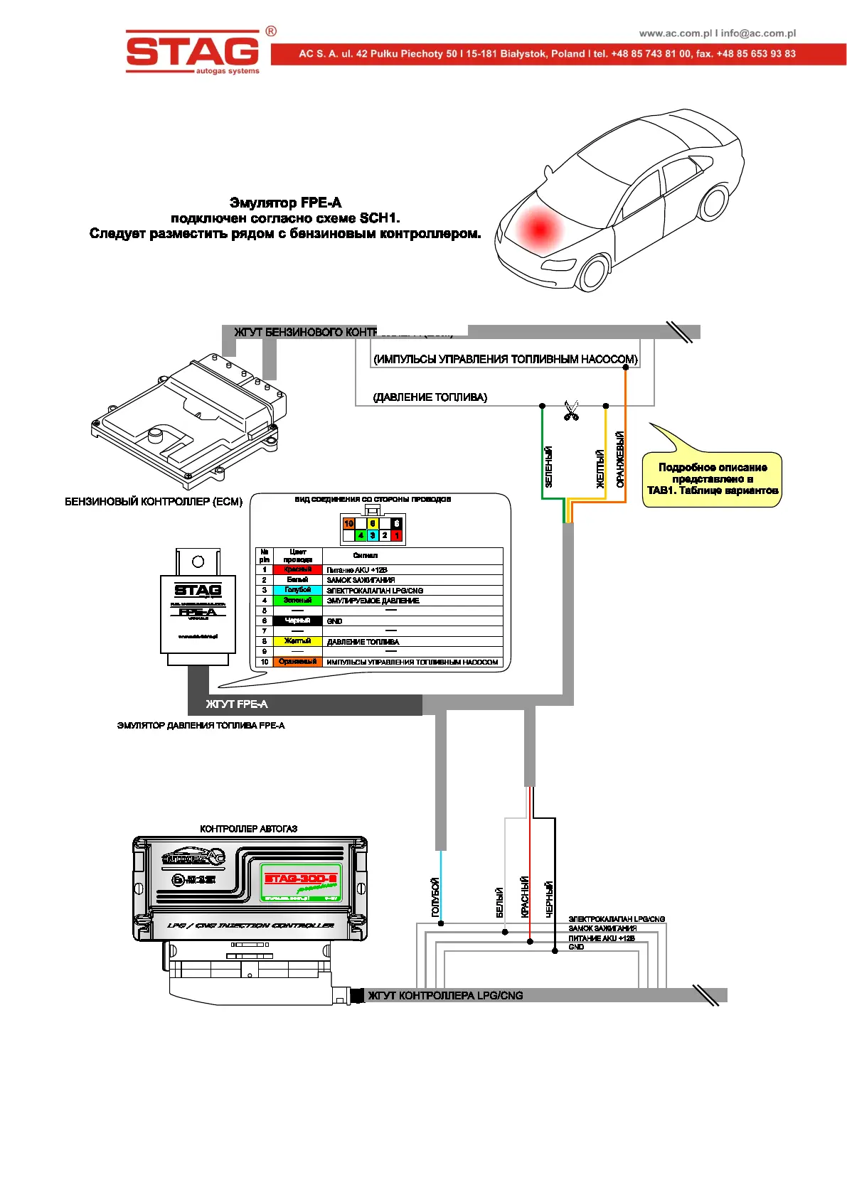 SCH 1. Схема подключения эмулятора давления топлива PE-A к проводке автомобиля