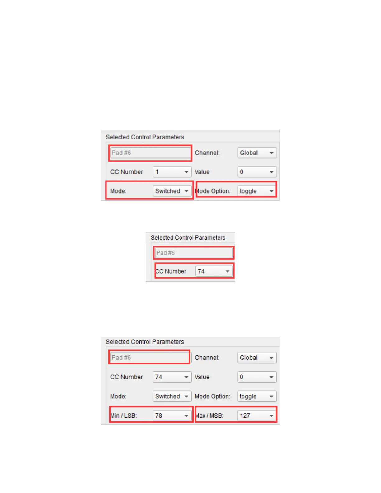 example sets Pad 6 to toggle two values for the Brightness filter (CC#74).