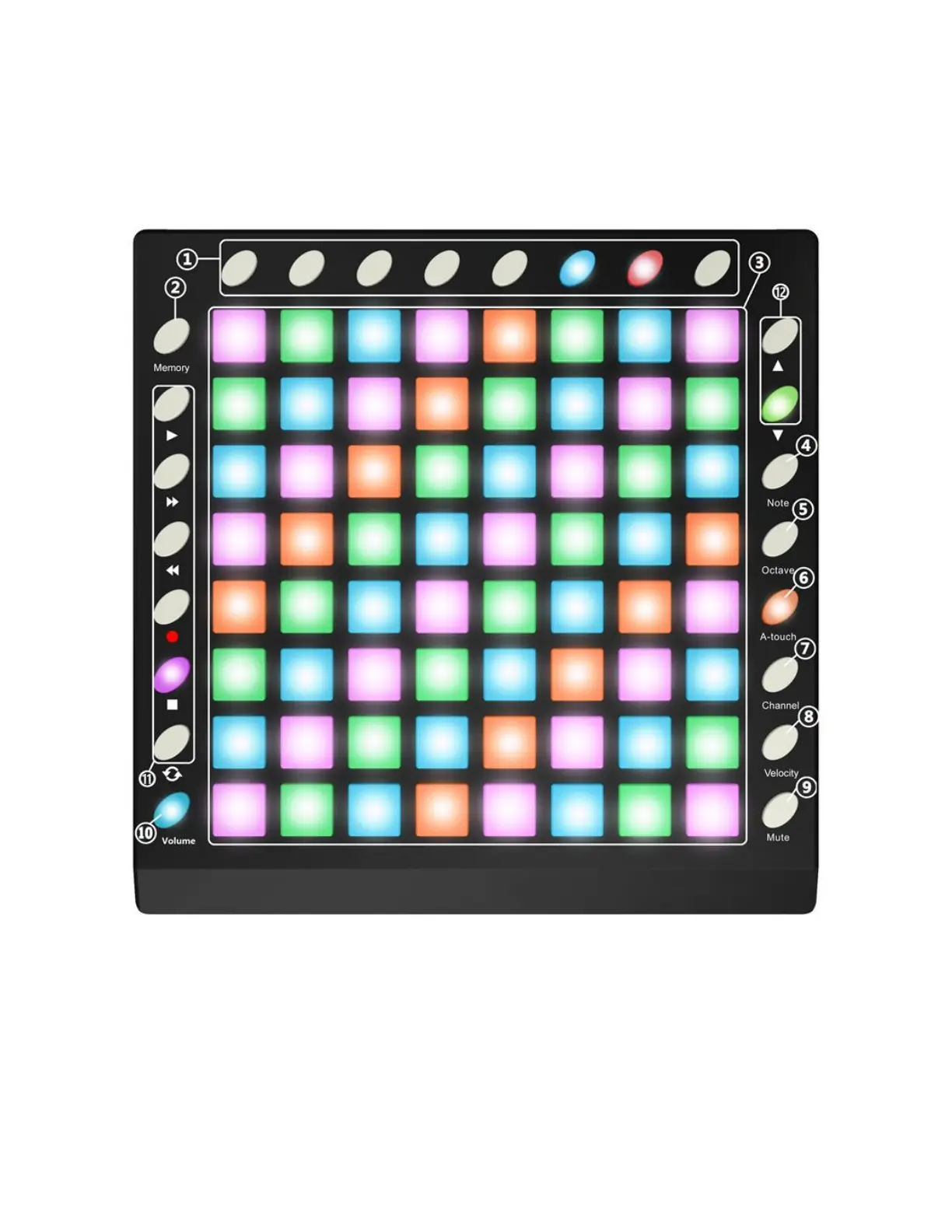 1. Parameter Control Buttons: These buttons can be assigned to send Control Change