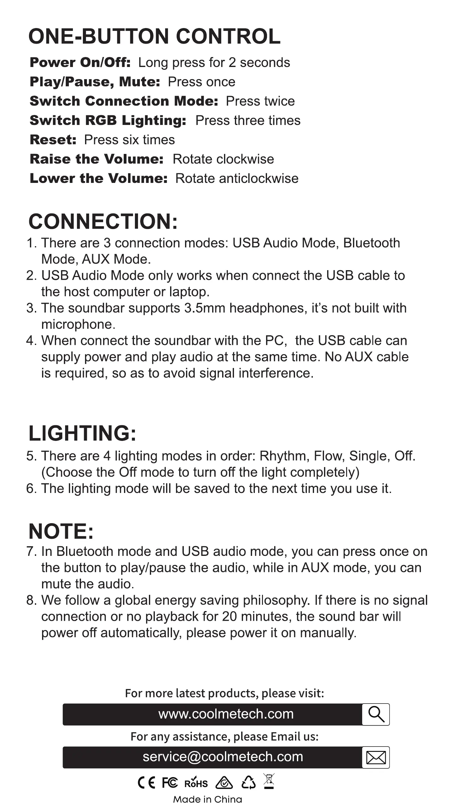 5. There are 4 lighting modes in order: Rhythm, Flow, Single, Off