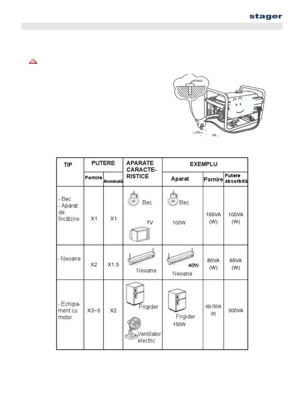 2. Urmatorul tabel ofera informatii privind conectarea aparatelor electrice la generator.