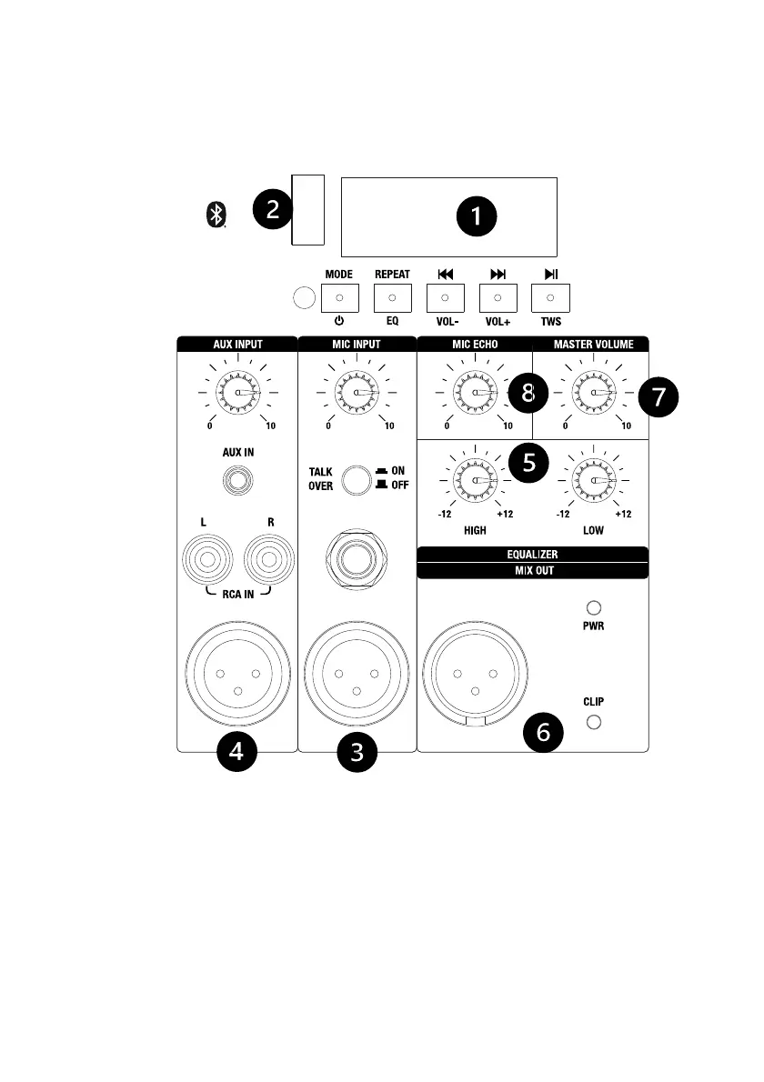 5. Equalizer for treble and bass frequencies. Range: +10dB/-10dB