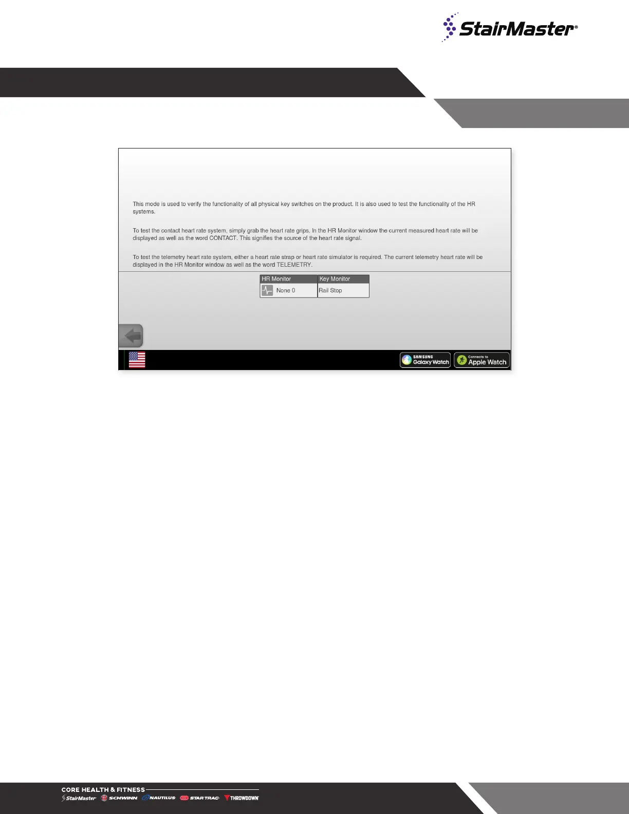 Allows the test of all hard keys, and the telemetry and contact heart rate.