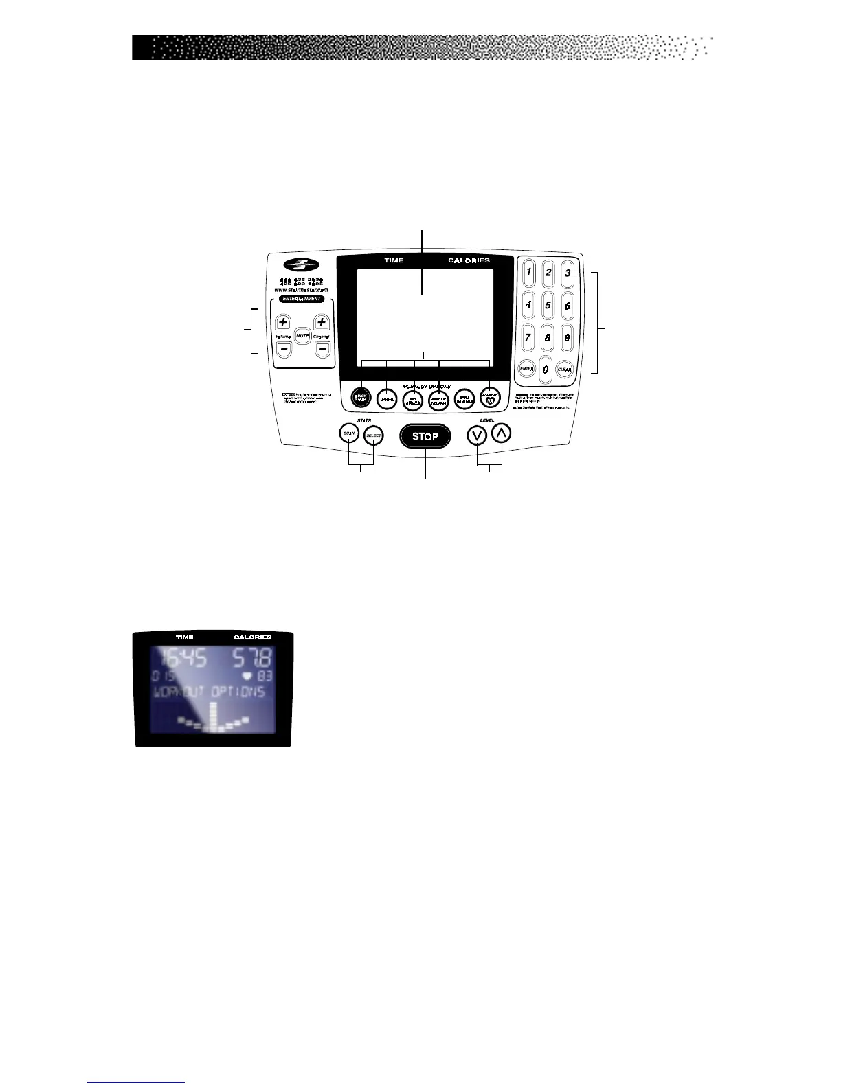 the entertainment keypad, the workout statistics, the stop key, and the intensity