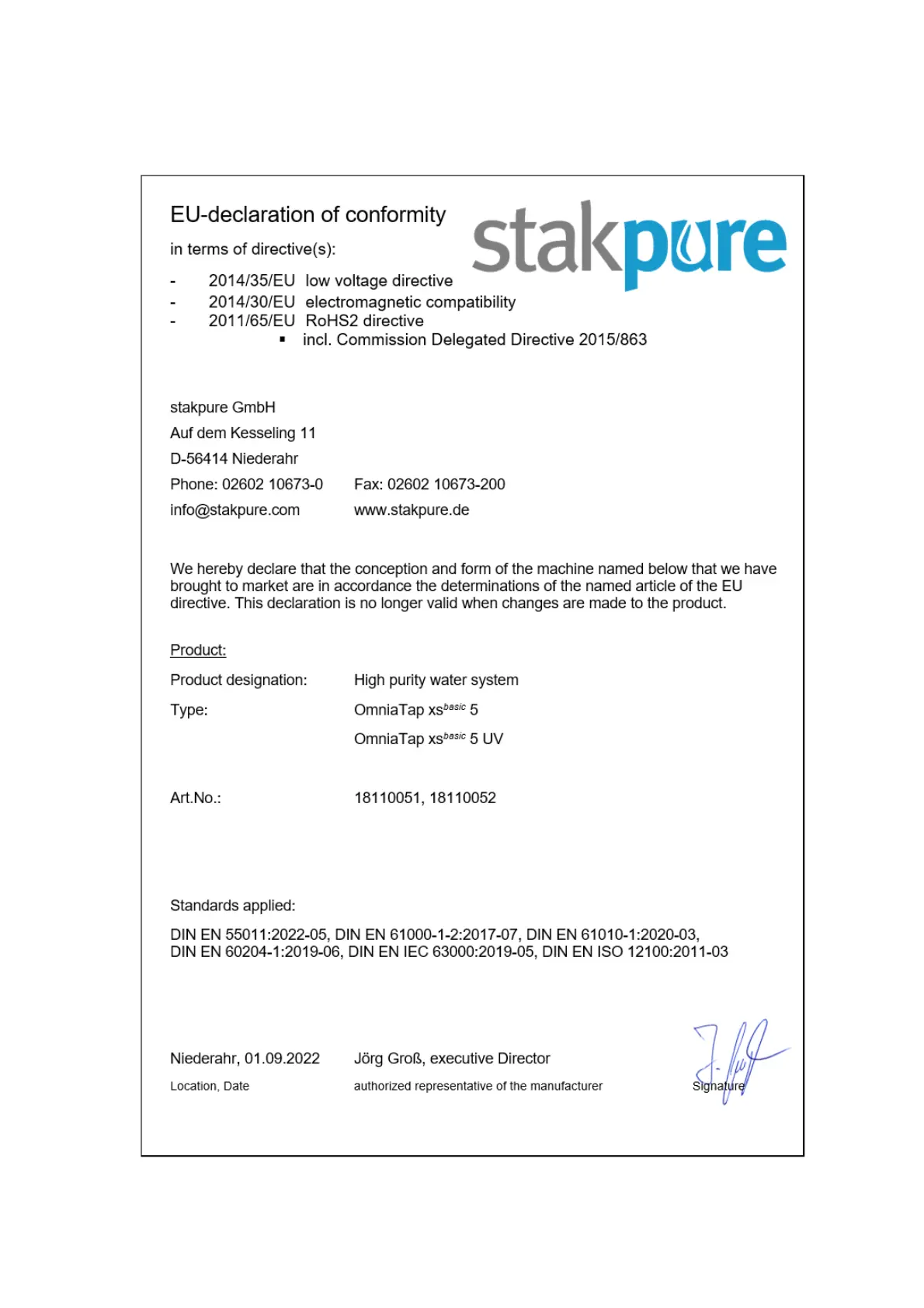Stakpure Omnia Tap xs basic - EU Declaration of Conformity