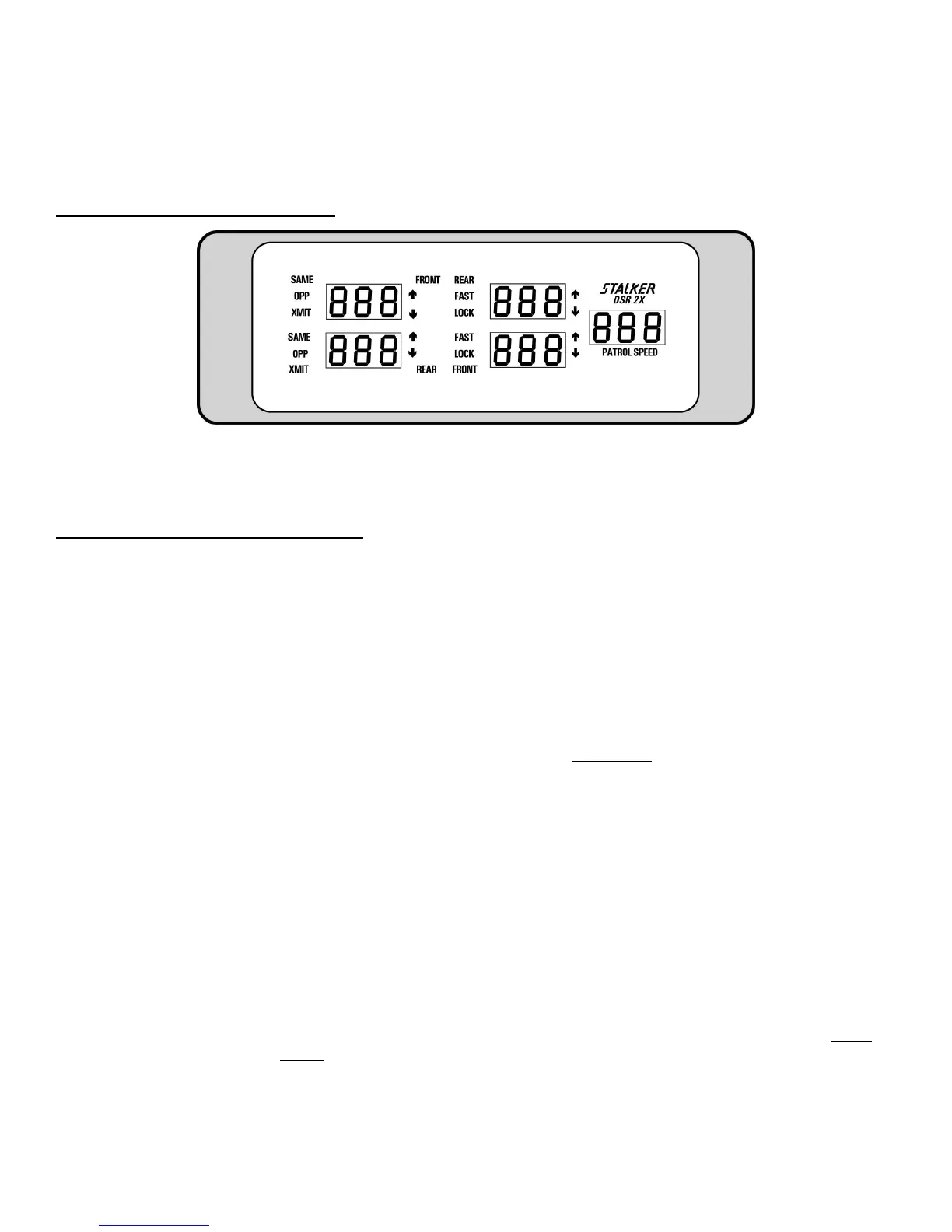 PATROL WINDOW: The right, three-digit LED window is the patrol window. In moving mode, the operator should