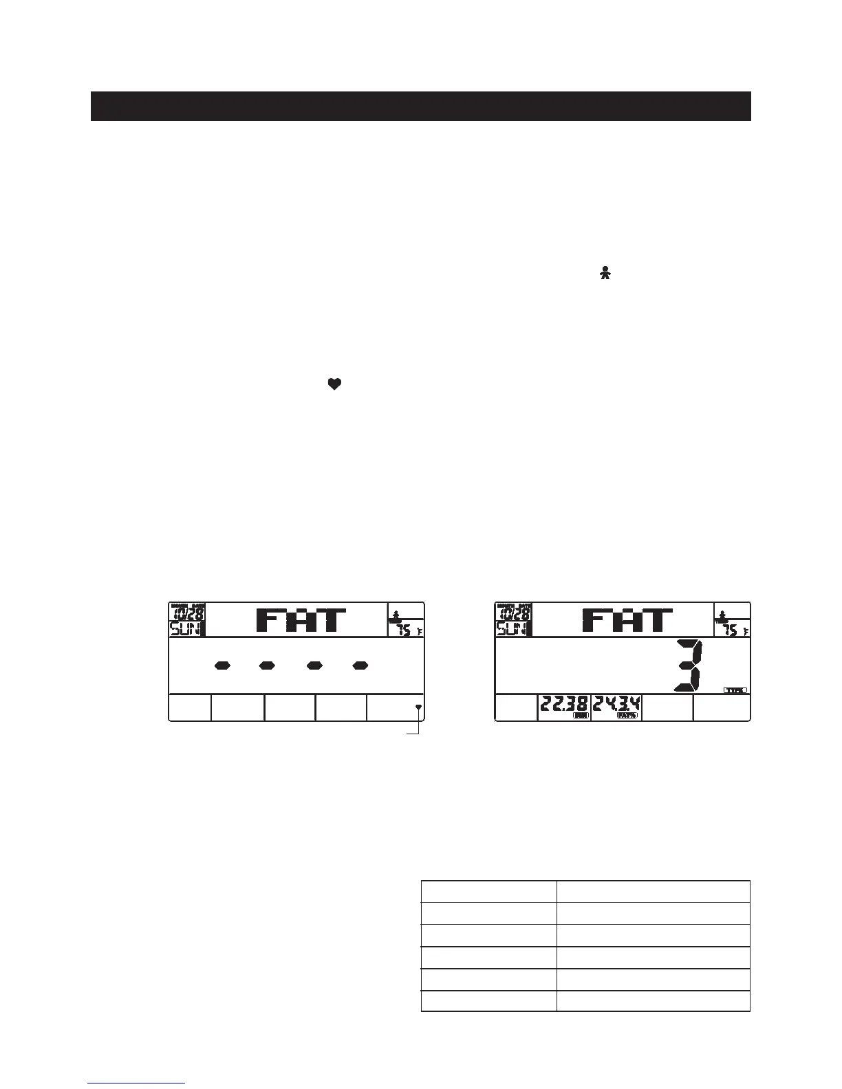later, the computer will show the information for BODY TYPE , FAT%, and BMI, refer to illustration D. Press