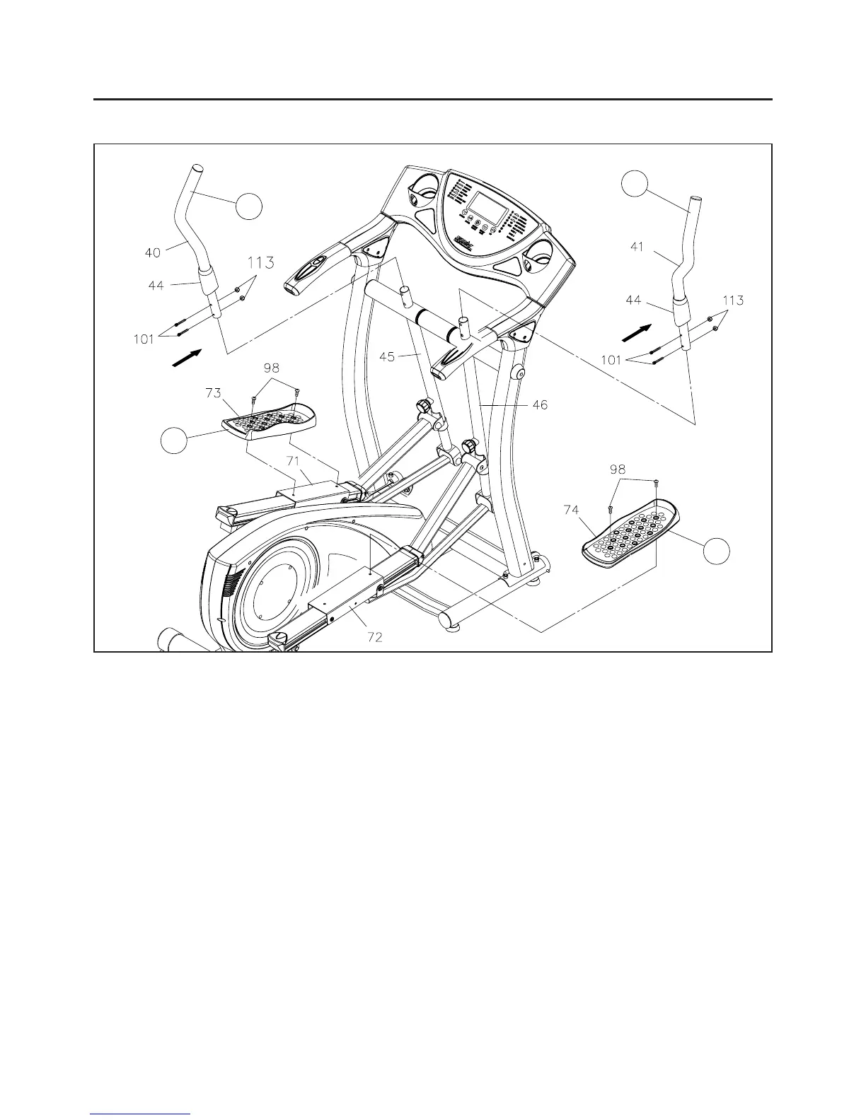 into the RIGHT PIVOTING ARM(46) and secure with SOCKET HEAD BOLTS(M6x1x35mm)(101) and