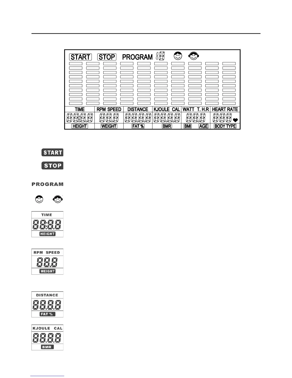 Displays the CALORIES burned, from zero to 9999 Kcal, or KJOULE, from 0 to 9999.